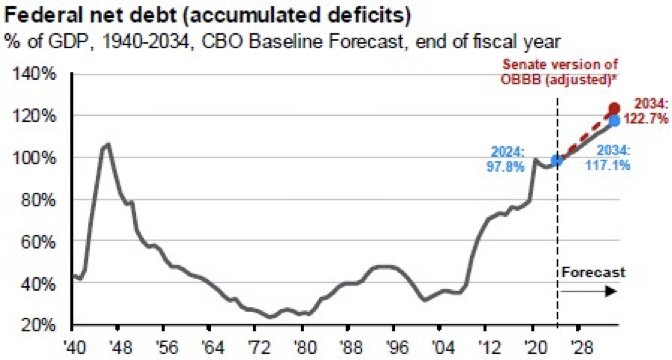 The OBBBA is currently forecast to increase the Federal debt $4.2 trillion by 2034. These forecasts are created in a vacuum so how it will play out in real time is something only time will tell. However, the debt issue which was talked about so much at the start of the year does not appear to be as big of a priority for the administration when taxes are the current talking point.[x]