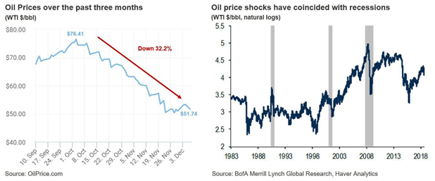 Oil has taken a dive during the fourth quarter of 2018, with West Texas Intermediate (WTI) prices falling from above $76 per barrel on Oct. 6 to just over $51 per barrel on Dec. 6. This sizable drop in crude has fueled fears of recession by many market followers given the strong historical connection between oil price shocks and economic recessions. In addition, correlations between crude oil prices and stock markets have been uncharacteristically high for much of 2018 – close to 0.80.