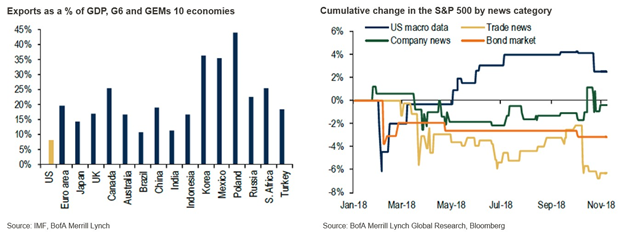 Considering this loose correlation, U.S. stock markets have moved disproportionately downward when trade talks have hit the front page. The chart on the right above from Bank of America– Merrill Lynch shows that “Trade News” has had a stronger downward effect on the S&P 500 Index than company news, the bond market and macroeconomic data on the U.S.