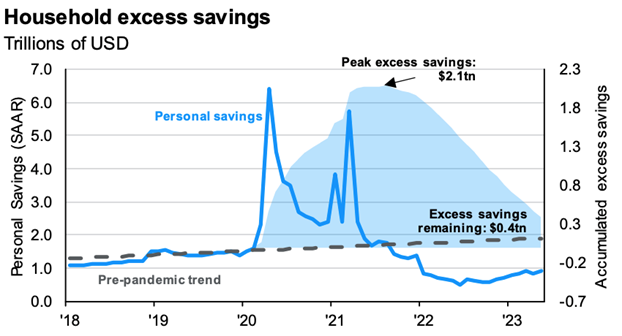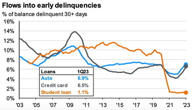 Previously, we discussed “Pandemic Cash” and the savings buffer this allowed for the consumer to build and navigate the last few years of frustration. Two points to make here. First, “Pandemic Cash” is almost out, finally. Second, student loan payments will resume beginning 10/01/23. These two circumstances will likely begin to put pressure on what has been a very resilient consumer over the last couple years.