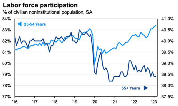 This is a trend that will hit the structural limits of an aging demographic, but is exciting nonetheless, with the participation rate for adults between the ages of 25 and 54 fully rebounding to pre-pandemic levels. The participation rate for adults aged 55 and over has remained subdued, reflecting an aging Baby-Boom population experiencing a migration to retirement.