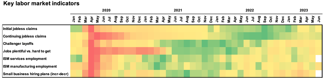 Source: BLS, FactSet, Conference Board, ISM, NFIB, J.P. Morgan Asset Mgmt. Heatmap shading is relative to the time period shown. For jobless claims and layoffs, red reflects higher values and green reflects lower values. For ISM employment PMI’s shading is centered at a 50 level, with values above 50 reflecting acceleration (shaded green) and below 50 indicating deceleration (shaded red) of employment. Guide to the Markets – U.S. Data are as of June 30, 2023