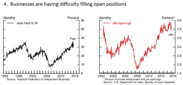 The lack of wage growth has been a frustration for quite a while. If the labor market remains strong as Chairman Powell and the FOMC hope, it may serve to drive wages higher. There are a couple of different metrics which can be looked at to help gauge the strength of labor markets. First is the broad measure of unemployment rates addressed above. Second we can look a bit more granular and see what employers are reporting regarding job offerings and ease of filling those openings.