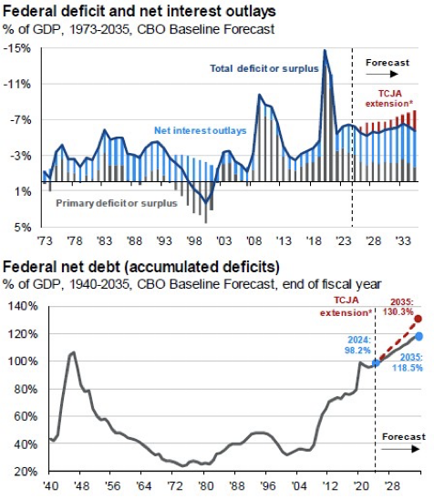 The extension of the TCJA does create problems which the infamously named DOGE crew is attempting to resolve. Current CBO estimates reflect increased deficit spending with an extension of current tax law as you can see below. Increased deficit spending will only exacerbate the cost to service the debt, further worsening the deficit until something in the financial system finally breaks. The red you see represents projected deficit spending and projected Federal net debt due to extending current tax laws.