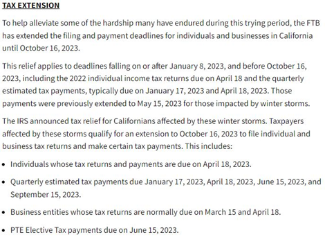 As many of you are probably now aware, most of California has been deemed a disaster zone because of the recent storms, except for those counties listed above. Due to this declaration the IRS and CA Franchise Tax Board have extended the filing of tax returns until October 16, 2023. Also extended to October 16th are payments for 2022 tax liabilities, 2023 estimated tax payments, and PTE Elective tax payments.