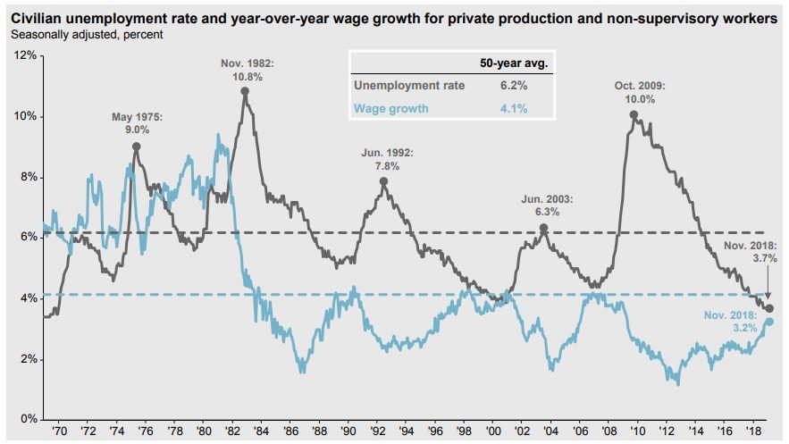 We are halfhearted in our optimism for 2019 market growth. The good news is that we have very low unemployment coupled with increasing wage growth, as seen below. Also notable from the graph, is that over the last thirty years convergence lasts for a year or two before a recession occurs and there is a corresponding spike in unemployment and slowdown in wage growth.