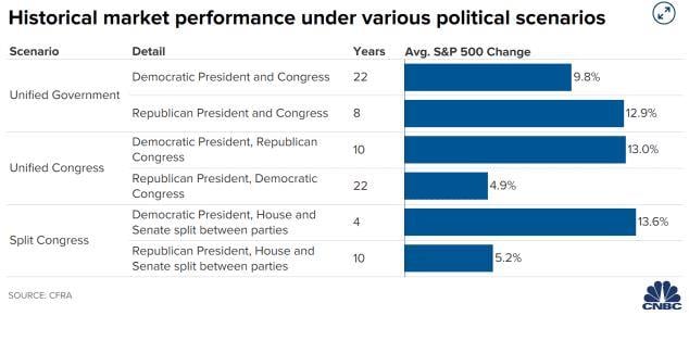 - It is easy to conflate politics and market performance in our minds. The reality is far more mundane with positive market performance no matter the political leadership scenario. Fiscal and monetary stimulus does influence the markets, and we have that in spades.