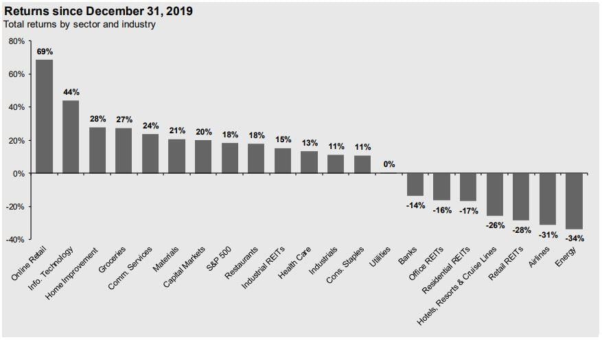 In the graph above you can see that during the last year growth has continued to become more expensive relative to value, continuing a trend which started several years ago. We have not reached the obscene overvaluations of the late 90’s, but it is obvious the gap between the two has been widening. Eventually this paradigm will shift. As we navigate the months ahead our expectation is to begin a rotation back into value to take advantage of a recovery on that side of the market and to take profits on the growth side. Another way to look at this is to breakdown sector by sector performance in 2020.