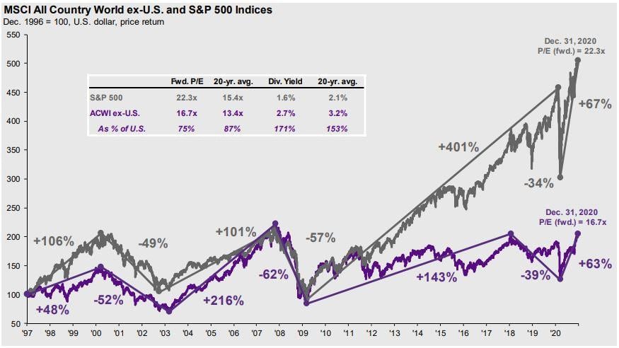International stocks have lagged the United States for quite some time. It is not a given that they will all of a sudden start performing better and close the gap. However, relative valuations are beginning to make the sector attractive as an increased portion of our overall asset allocation strategy.