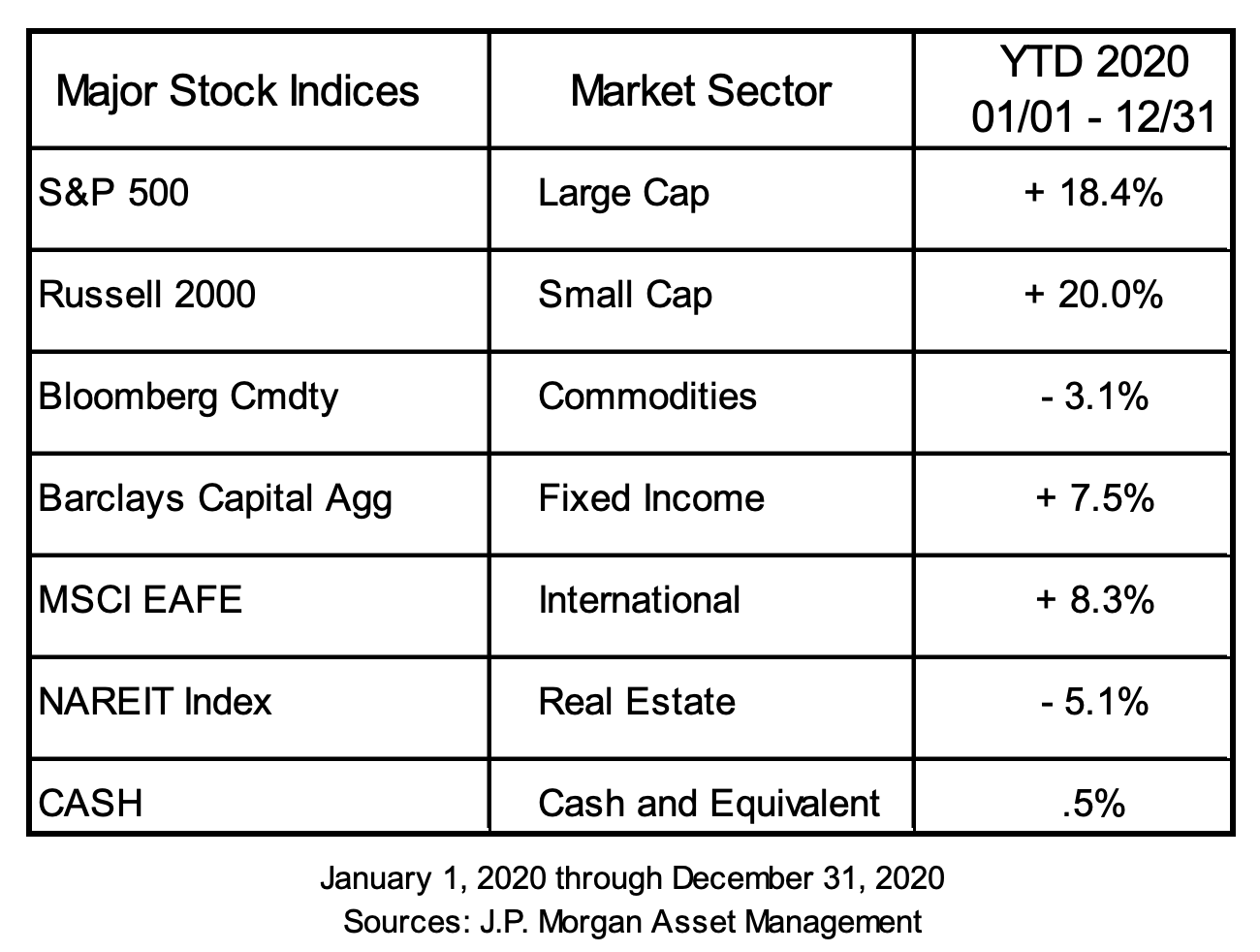 After turning down 34% in mid-March the S&P still closed up 16% for the year. Adjusted for dividends it was up 18.4%. U.S. Large and Small Cap stocks, in addition to Emerging Market equities, paced the global recovery. Commodities and Real Estate Investment Trusts (REIT’s) ended the year down.