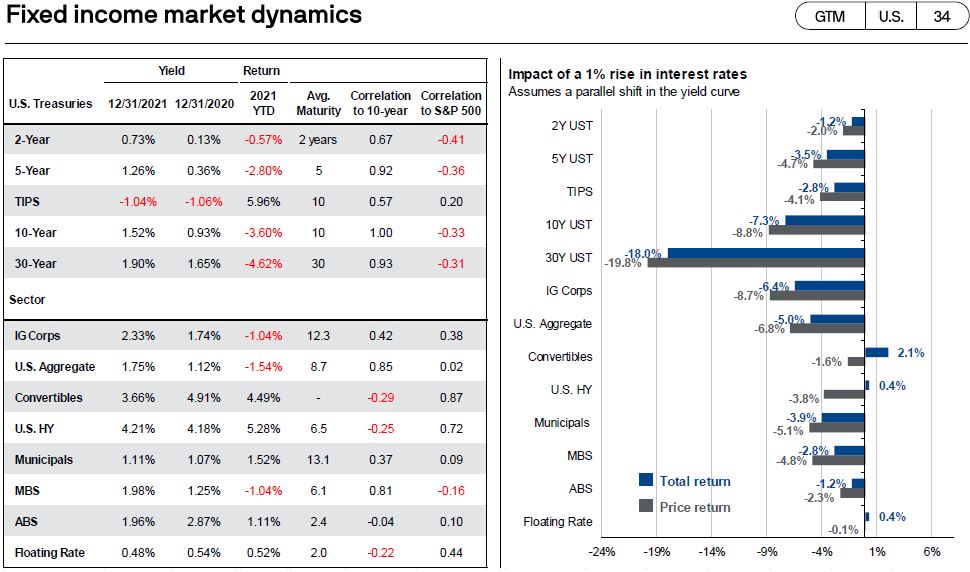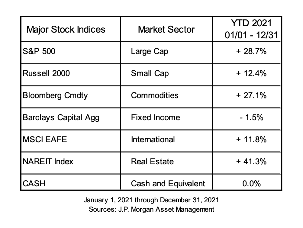 The second year of Covid has come to a close with a new variant taking the stage. Markets performed well, except for tech equities and bonds which took a beating into the end of the year. As referenced in our prior update, the general performance of the stock market has been driven primarily by very large companies with strong returns masking the slow recovery for many of the S&P constituents. At this point in the recovery we are taking a broad diversification approach for equities and protecting against interest rate increases for fixed income. With tech taking a big hit, our more growth/tech oriented portfolios have underperformed the market as a whole. We continue to believe in the technology transformation and are adjusting portfolios to take advantage of this trend over the next 5 to 10 years.