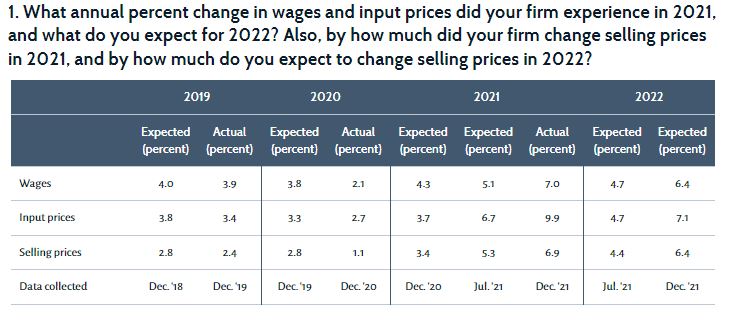 As you can see in the column data on the right, inflation expectations for 2022 have increased and actual inflation in 2021 was substantially higher than expected. More significantly, 2022 inflation expectations from business responses in Dec ’21 were much higher than the responses in July ’21. In the same data set from the Fed the following question was asked, “If costs (including wages) are increasing, to what extent are you passing the higher costs on to customers in the way of price increases?” 75.9% of the respondents indicated they are passing some or all of the increase on to customers.