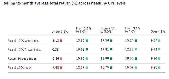 There is indeed a silver lining to be found. In inflationary environments stocks have traditionally provided a hedge against inflation, particularly in more moderate ranges from 1.1% to 4%. Current inflation presages reduced returns over time, but with moderated inflation we anticipate stocks to perform well over time. Low or negative inflation periods have much worse returns as you can see from the chart above.