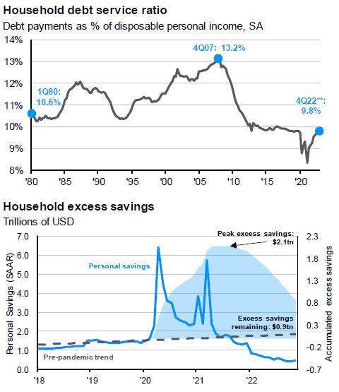 As you can see in the Household Excess Savings graph above, there was a significant increase in the amount of cash and cash equivalents on hand for the normal household in the U.S., primarily driven by pandemic related government stimulus programs. Savings peaked in mid-2021 and households have been eating into the funds over the last year and a half. Low interest rates and fiscal stimulus helped reduce the household debt service ratio in the early part of the pandemic. However, dwindling cash reserves and rapidly increasing interest rates are flipping the script. Consumers are running out of cash and debt service ratios are returning to where they were pre-pandemic. That is about to get worse with government programs limiting or stopping student loan payments about to run out. The unfortunate conclusion is that the U.S. consumer is running out of fuel.