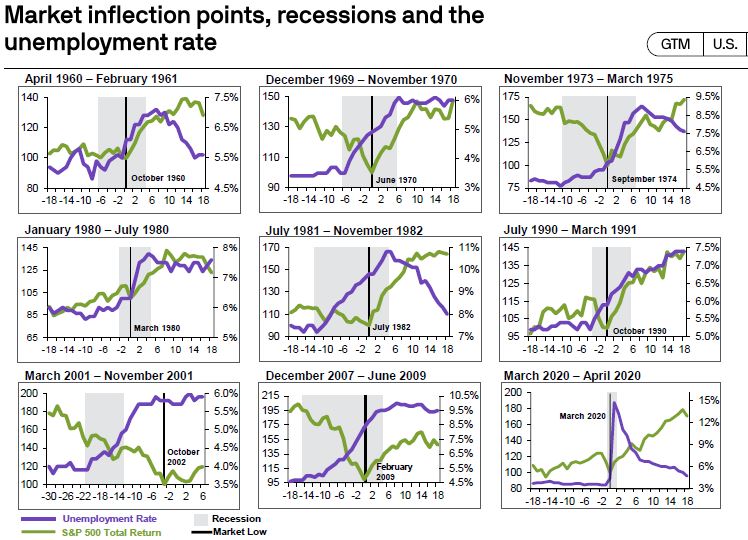 As you can see above, markets typically hit a bottom before the worst of the worst is being felt by the average household. The vertical black line in each of the graphs above represents the market bottom. With the exception of the Dot-Com bust of the early 2000’s, the market bottom occurred before the end of the recessionary period in grey. This is actually good news. When you can see the light at the end of the tunnel, it doesn’t mean you are at the end, but it does mean you can see the way out. We could not say that 6 months ago.