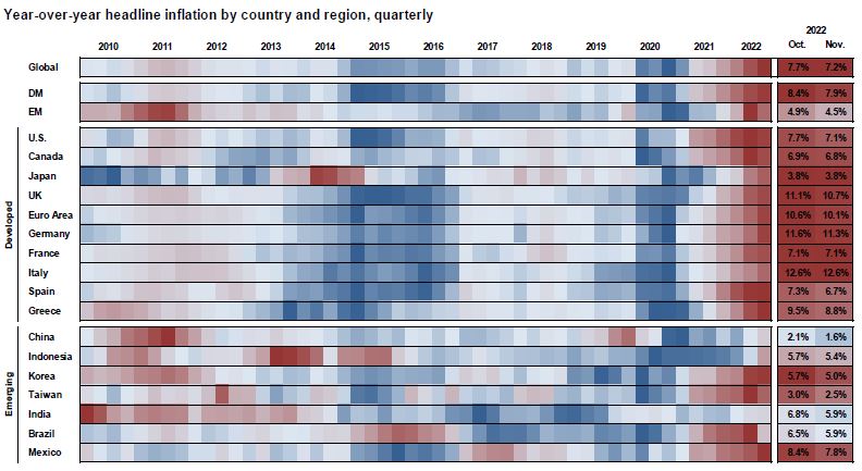 Inflation is on its way down both domestically and globally. No one is waving a flag signifying the end is in sight as you can see above with inflation in the red in most parts of the world. However, the pace is slowing and it looks like we have peaked. A global slowdown in inflation does not mean that prices are coming down for everything and everyone.
