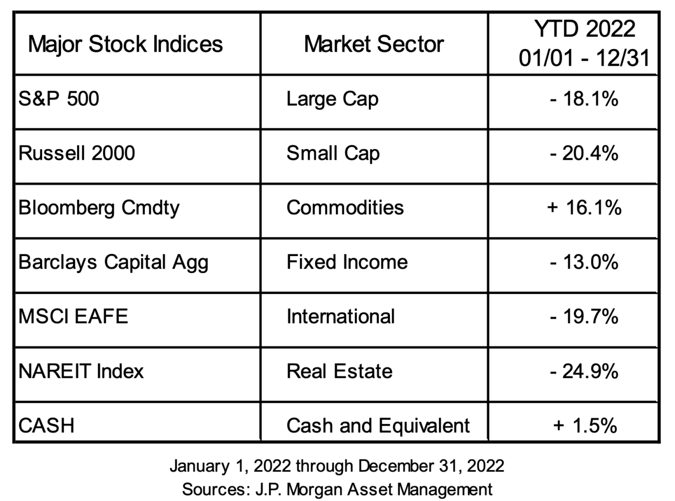 The only positive performers on the year were commodities and cash. This is quite a flip flop to recent history in which commodities were one of the worst performers in 10 of the last 15 years. Fixed income was down -13% providing little shelter with domestic equities also down -18.1%, or worse. On the plus side, the sell-off in bonds as interest rates rose does provide opportunity moving forward for more conservative investors. We will discuss this in more detail later.