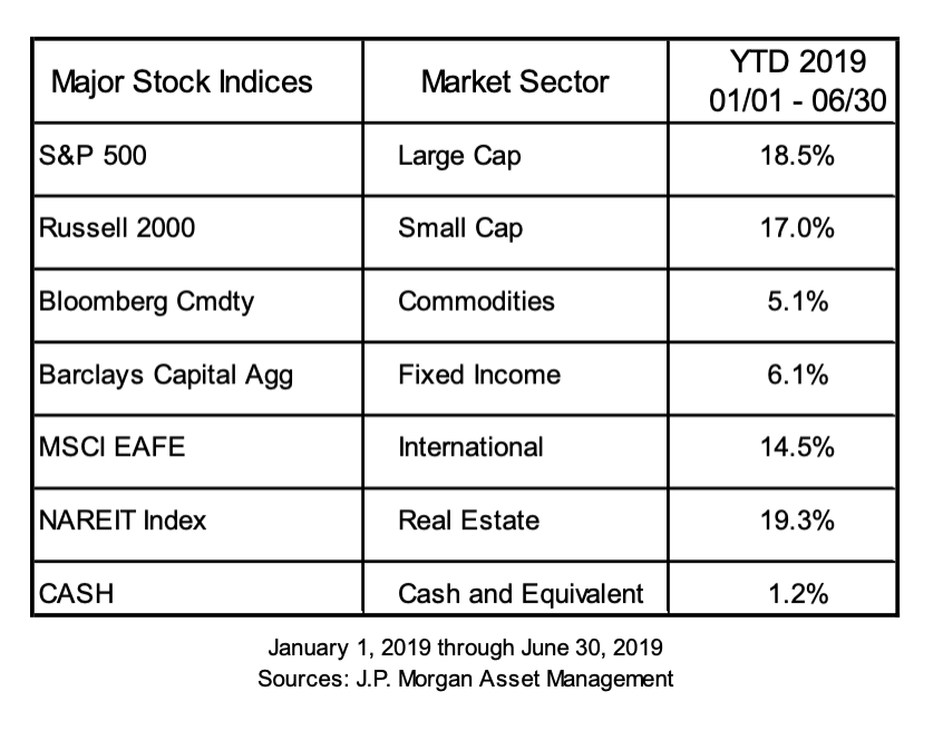 Despite that, it has been a good year so far. Interest rate stabilization and risk aversion have strengthened bond markets steadying the fixed income side of investment portfolios. Equity markets have, mostly, held the course in their recovery from the 4th quarter of 2018. Our expectation is that much of the run-up has occurred with new market highs having been set recently. Primarily, our belief is that with trade concerns and continued slowing global growth it will be hard to drive substantial market increases at this time without having economic data turn more positive.