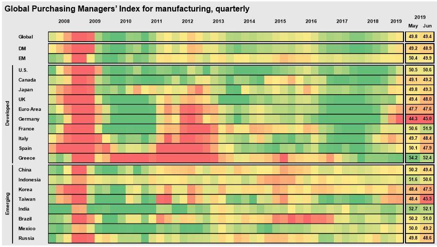 Global growth has slowed down. The global reading of the Purchasing Managers Index at the end of last quarter was holding steady at 50.6, readings over 50 indicate growth. The reading at the end of June of 49.4 indicates a slightly contracting global economy. A variety of data points confirm this change in the status quo.