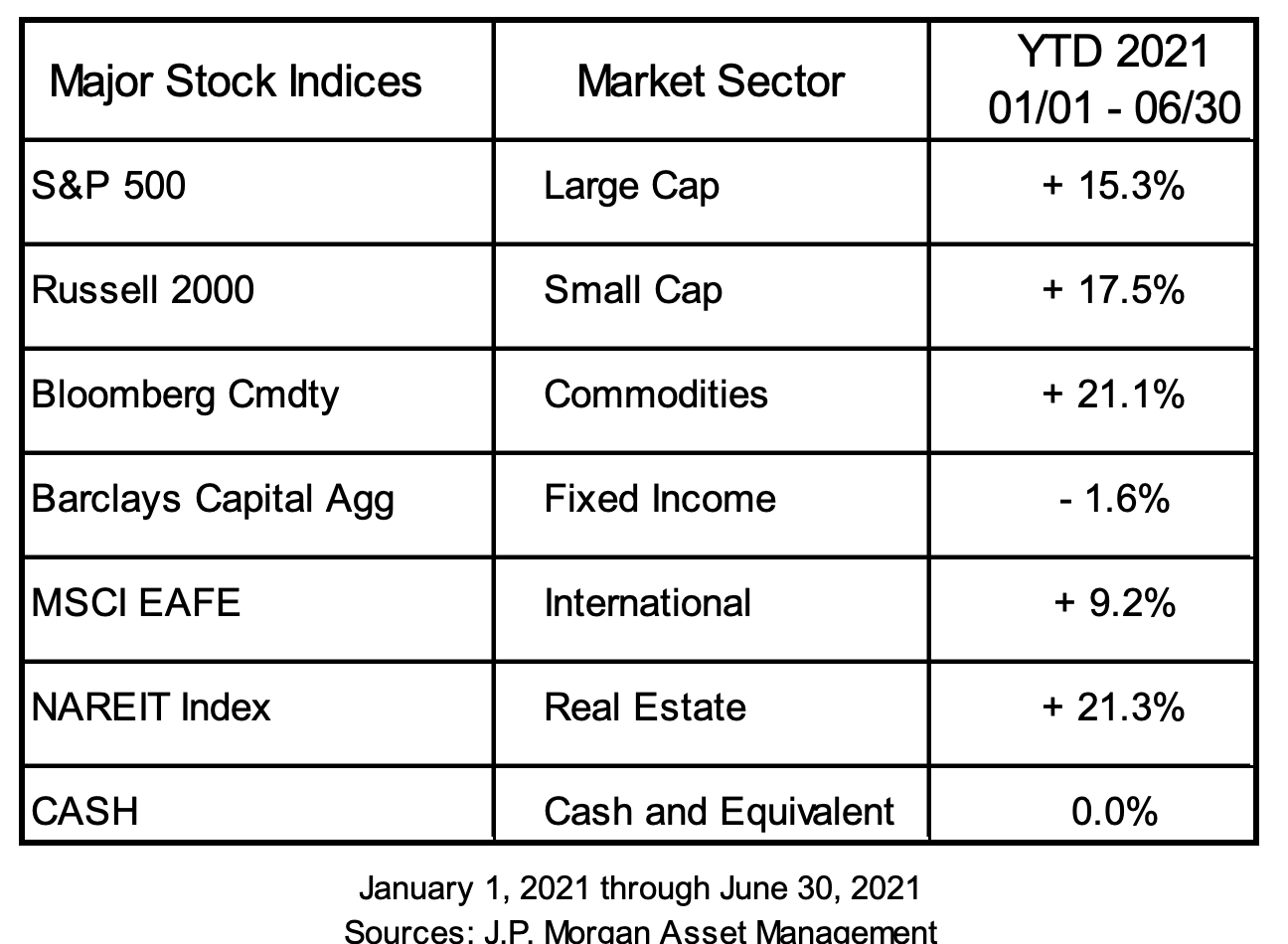 This quote from one of the foremost conservationists in the history of the United States has nothing to do with the markets, but sums up the general feeling we have with investing right now. A healthy dose of fear in lofty valuations coupled with a consistent investment philosophy has resulted in solid performance year-to-date, i.e. a good life instead of a poor one. With inflation on the table, real estate and commodities are the best performers year-to-date. If inflation proves transitory, we expect the commodity price increase to play itself out. For example, the price of lumber made the news just a couple months ago when the price jumped three-fold from pre-pandemic levels. Since that time, as you can see in the graph below, it has plummeted.