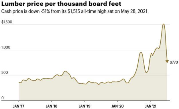1 Lambert, Lance. “Lumber Prices Continue to Plummet-down 49% from the Peak.” Fortune, Fortune, 7 July 2021, fortune.com/2021/07/07/lumber-prices-2021-chart-update-july-price-of-lumber-falling-wood-costs/.