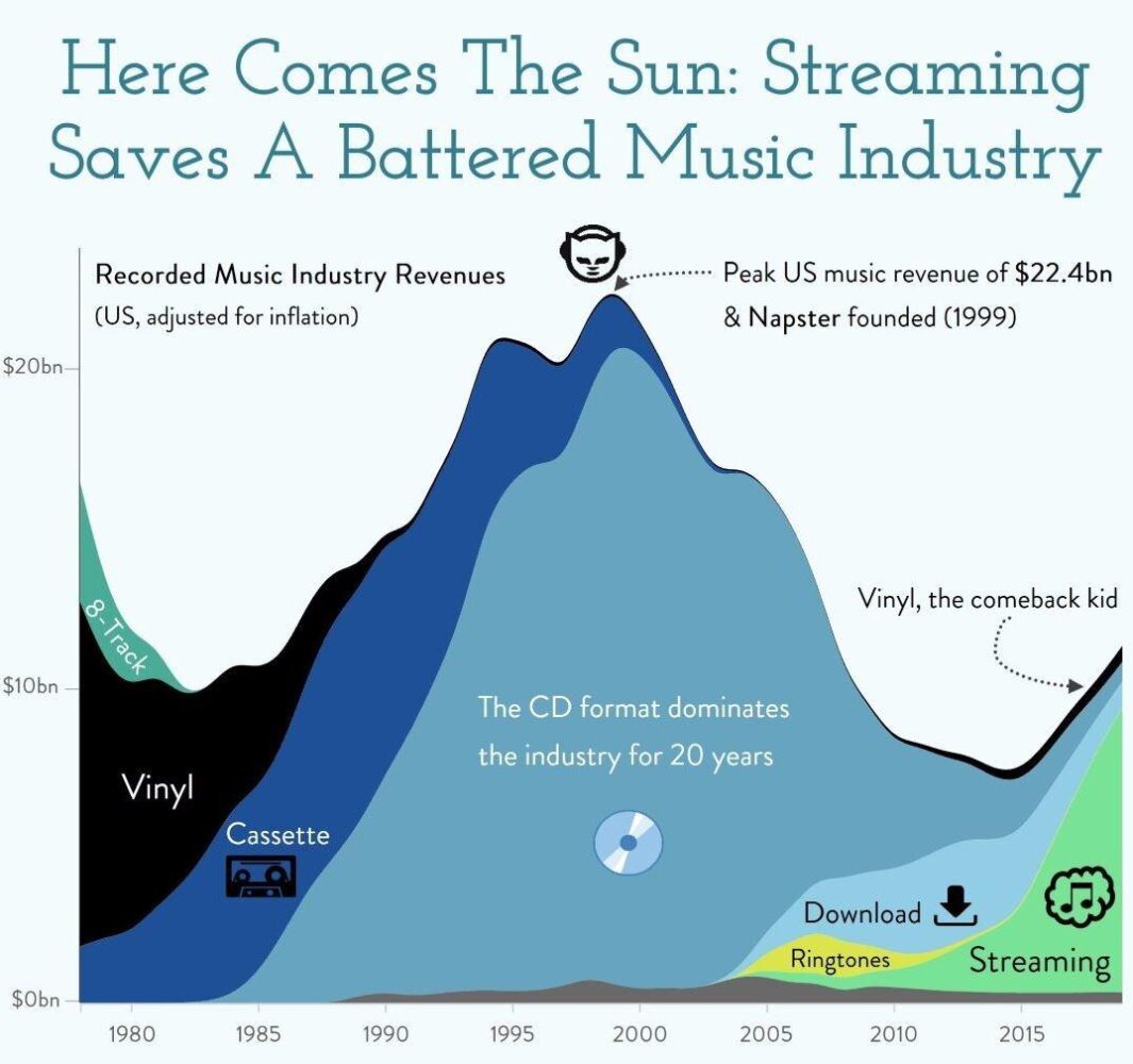 Our interesting piece of information for the day is brought to you below by a historical representation of music industry revenues over time. If you grew up in the 90’s you might argue revenue peaked because music also peaked, but that is a fight for another day. The reality is that peak revenue occurred when the technology for file-sharing really took off. After all, why buy music when someone somewhere else in the world already did, and they are willing to share it with you for free? A long precipitous decline in music industry revenue followed until the last decade when streaming services took over and revenue began to increase again.