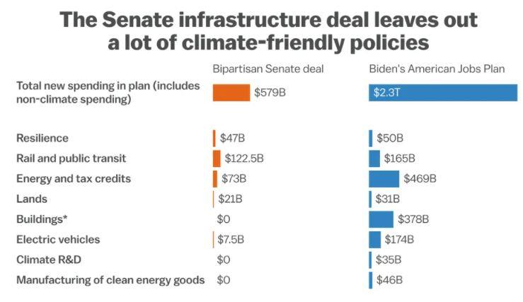 The next round of spending looks like it is right around the corner. You may have heard that the Senate has come to terms on a bipartisan infrastructure deal that totals $1.2 trillion over 8 years with $579 billion in new spending on top of baseline planned spending. The dollars are spreadout as you can see below, with the original proposal on the right and the bipartisan deal on the left: