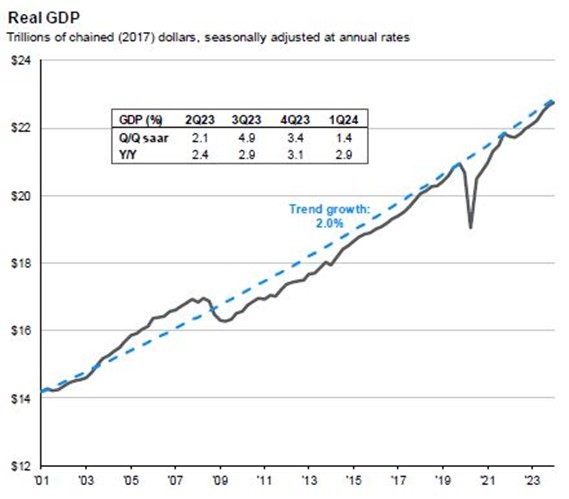 The economy slowed sharply at the beginning of the year with annualized GDP growth of 1.3% but rebounded strongly in the 2nd quarter with a current annualized estimate of 2.7% GDP growth. This seems to be an indication that a soft-landing is more and more possible. The resiliency of the U.S. economy has been a shock.[ii]