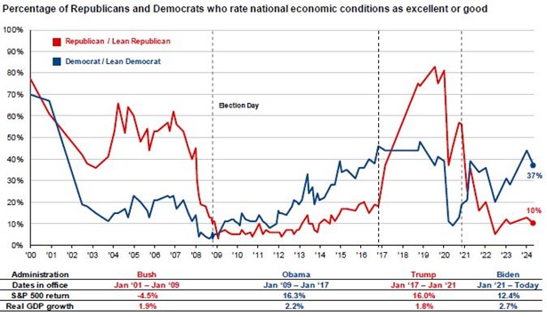 Economic momentum has remained solid but improvement on inflation has been slow. There are risks worth monitoring in the form of geo-political tension, but as a general observation, these are the same issues we have been dealing with for the last year or two. Momentum in the U.S. election for President this year seems to have swung sharply towards former President Trump. We are not in the habit of speculating on which direction the economy will go based on who the President is. The graph below can provide some context for that.