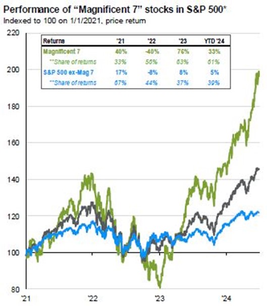 - A narrow market recovery continues to be driven by the Magnificent 7 stocks.