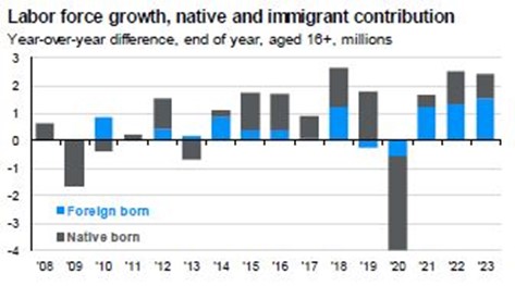 Labor growth in the U.S. has been strong and the labor market has normalized after the post-pandemic boom. A significant input to our labor pool has been net positive migration to the United States. In a world where many countries are facing population crises this is potentially a boon for the U.S., although it is an issue with a lot of politics involved.