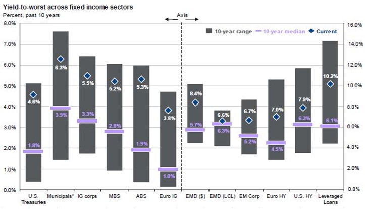 What this communicates to us is that it continues to be a good time to focus on the fixed income side of asset allocation strategies. Above is the Yield-to-Worst across a variety of fixed income sectors. Current yields remain far above the 10-year median represented by the purple line. There is an opportunity in fixed income that will be available for an unknown period of time. We continue to encourage clients sitting on the sidelines with cash to look at fixed income as a good way to do something as opposed to nothing. Defaults remain low across most fixed income sectors and yields are substantially better than they have been for years.