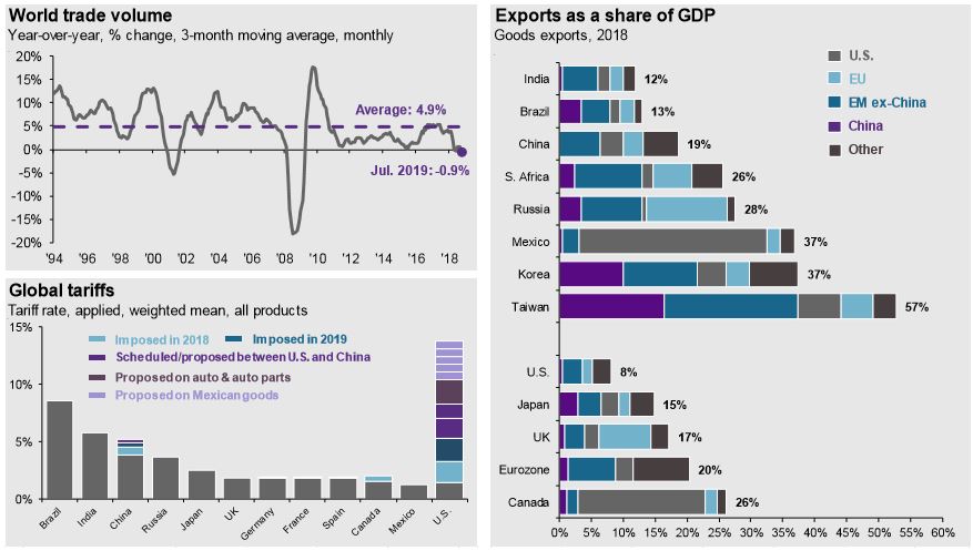 The graph in the top left is a strong statement for how global trade has been impacted throughout the tariff period. Trade has generally stalled, and most recently contracted, as protectionist trade policy has been enacted. Policy and tariffs play some part in this slowdown along with the slowdown in global economic growth. In the most recent Federal Reserve meeting minutes from September, the decrease in net exports from the U.S. with the world resulted in a “drag of about ¾ percentage point on real GDP growth in the second quarter”. This is a real issue, which helps to explain why President Trump’s tweets on the topic garner so much attention and increase market volatility.iv