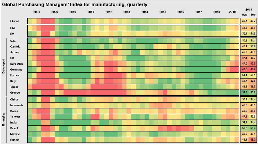 As you can see from the “Global tariffs” graph on the bottom left, prior to the trade war the US was on the low end of tariff protections. Brazil, India, and China have historically had the highest level of tariffs. The grey, teal and blue areas denote tariffs now in force. The various purple colors are proposed increases in protectionist policies not yet in place. In a short time, the U.S. has gone from a mostly free-trade country to a rapidly protectionist one. This issue in and of itself is unlikely to bring the U.S. to a recession, but when combined with the following observation, again by the Federal Reserve, that “growth slowed sharply in Europe…Growth also slowed in China and India. Recent indicators suggested widespread weakness in manufacturing abroad…”, it becomes concerning.v