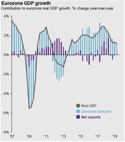 Answering the question of what is going on in Europe is challenging. Germany has not officially tipped into recession yet but the most recent estimate from the Bundesbank, the German Central Bank, is that “German economic output could have decreased slightly in the third quarter of 2019.” If this is the case then they will officially be in a recession with two consecutive quarters of slightly negative growth. The German stock market, the DAX, peaked in January 2018, fell roughly 24% and has slowly recovered although it still sits short of its high nearly 2 years ago. Germany is unique compared to the U.S. in that it is a manufacturing and export country. 47.3% of German GDP comes from export activities whereas only 12.1% of U.S. GDP is generated in a similar fashion. This makes them far more sensitive to trade shocks. With the escalated trade tensions between the U.S. and China impacting global markets and Brexit happening on their doorstep this has not boded well for Germany. For that matter, France has begun to slow as well along with the broader Eurozone. viii, ix