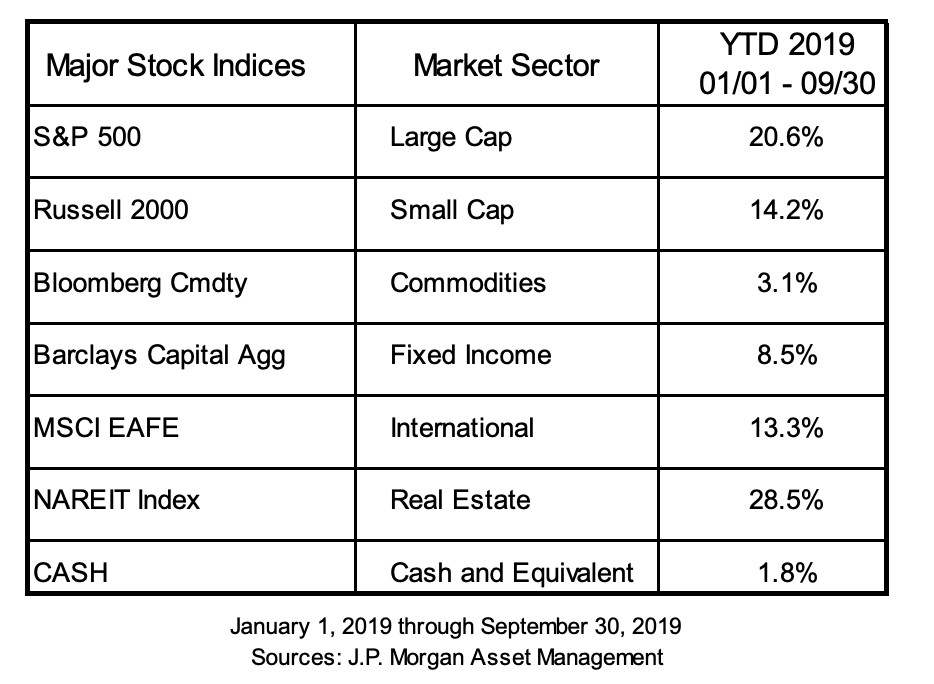 Chair Jerome Powell began his most recent press conference with a generally positive statement about where we are today. Market performance Year-to-Date is in line with his public address as all asset classes have held steady. Real Estate Investment Trusts have led the way with the S&P 500 following in a distant second with the remaining asset classes somewhere after. Cash has performed the same as it did in 2018 at 1.8% but, unlike last year, it is the worst performer of all. Asset allocation strategies following Modern Portfolio Theory have generally performed in the middle of the pack depending on the growth tilt for a given strategy from Conservative to Growth.i