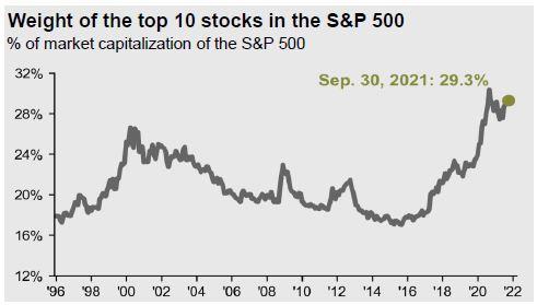 - Stock concentration in the S&P 500 is leading us to make changes in how we allocate between passive and active management.