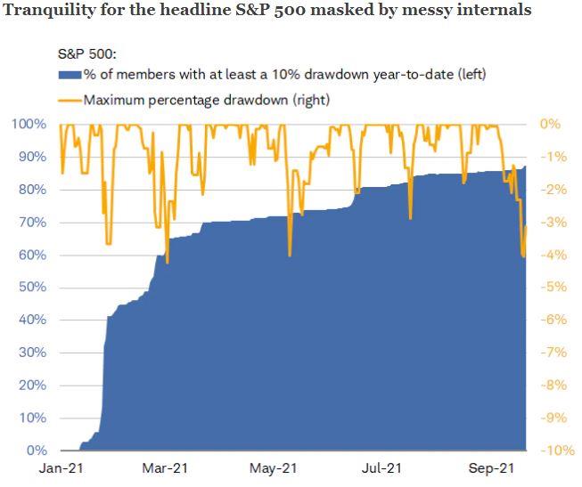 Passive investing works, but when concentration in such a small group of companies reaches these levels it makes sense to find ways to reduce this exposure and diversify away some of that risk. We have been working on this and are introducing updates to the equity sleeves as tax and risk efficiency allow. One final way to look at this is to transpose the S&P 500 performance year-to-date on top of the percentage of S&P 500 index members with a year-to-date drawdown.