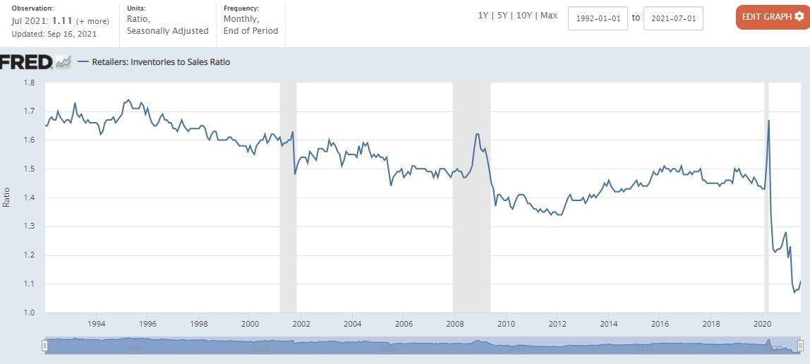 The lower the figure in the graph above, with a most recent reading just above 1.1, the shorter period of time available inventories can cover contemporaneous retail purchases by consumers. Currently, 1.1 months of inventory are available to cover current sales, making the logjam of ships sitting off of coasts around the world a real problem should any sneeze occur somewhere else in the supply chain.