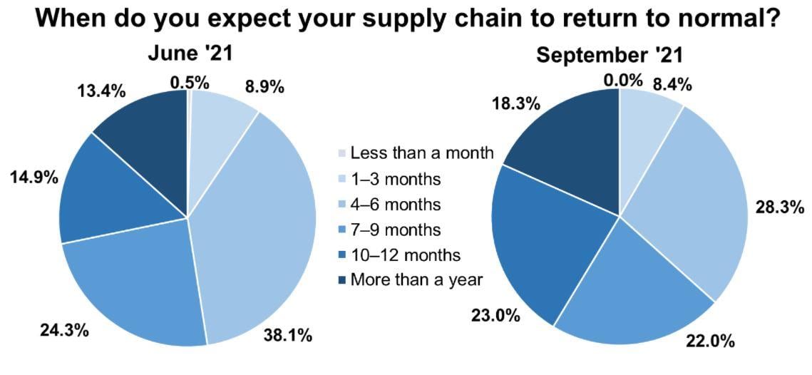 The Federal Reserve Bank of Dallas operates monthly business outlook surveys available on their website, www.dallasfed.org. Their most recent survey question in September asked, “When do you expect your supply chain to return to normal?” The data is is not encouraging.