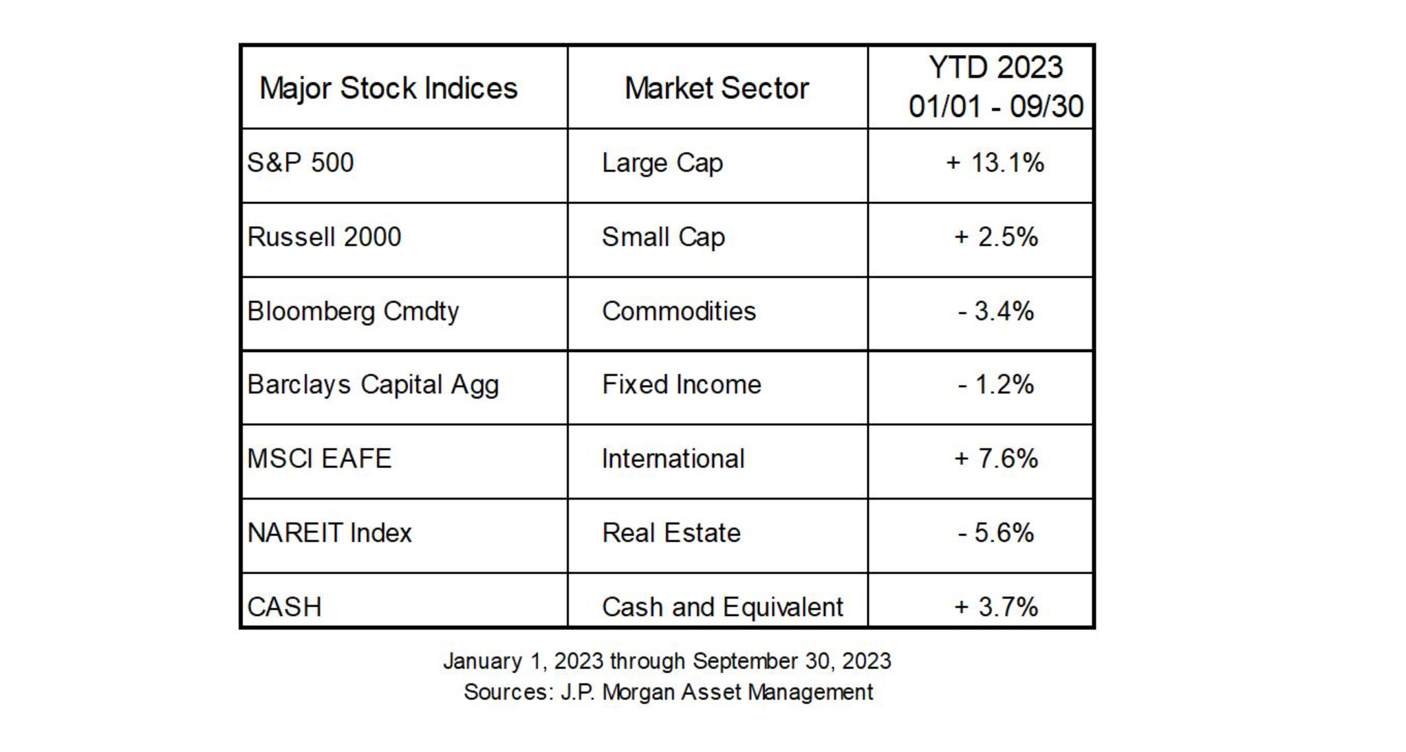 A term has been borrowed from Hollywood to describe the best stocks of the year, “The Magnificent Seven”. Apple, Microsoft, Alphabet (Google), Nvidia, Tesla, Amazon, and Meta (Facebook) have driven most of the stock market returns this year for the S&P 500. Fixed income has experienced another down year, though not as significant as last year. Interest rates have risen substantially as the Federal Reserve has increased the Fed Funds rate into the 5.25% - 5.50% range. With positive returns being so concentrated in a small number of stocks, returns year-to-date have been muted across the major asset classes with the exception of the S&P 500, which has a high concentration of the aforementioned seven stocks. i
