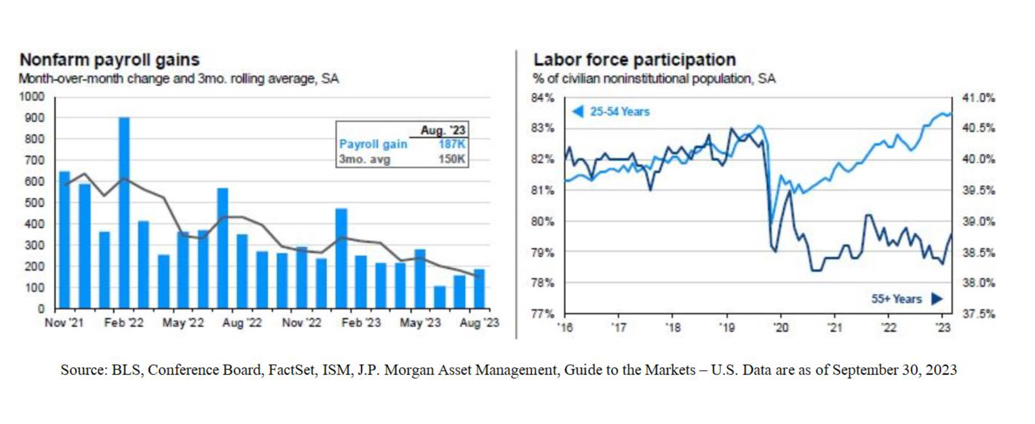 Wage growth is still above the historic average, 4.5% current growth versus historical growth of 4% as you can see in the graph on the previous page. Non-farm payroll gains have slowed down over the last couple years as you can see below. However, it is highly likely for the labor market to remain tight as structural employment issues remain a concern. By structural employment we are referring to the labor force participation rate and the availability of workers. Side by side with payroll gains below is the labor force participation rate broken into two cohorts, 25-54 year old workers, and 55+ aged workers.