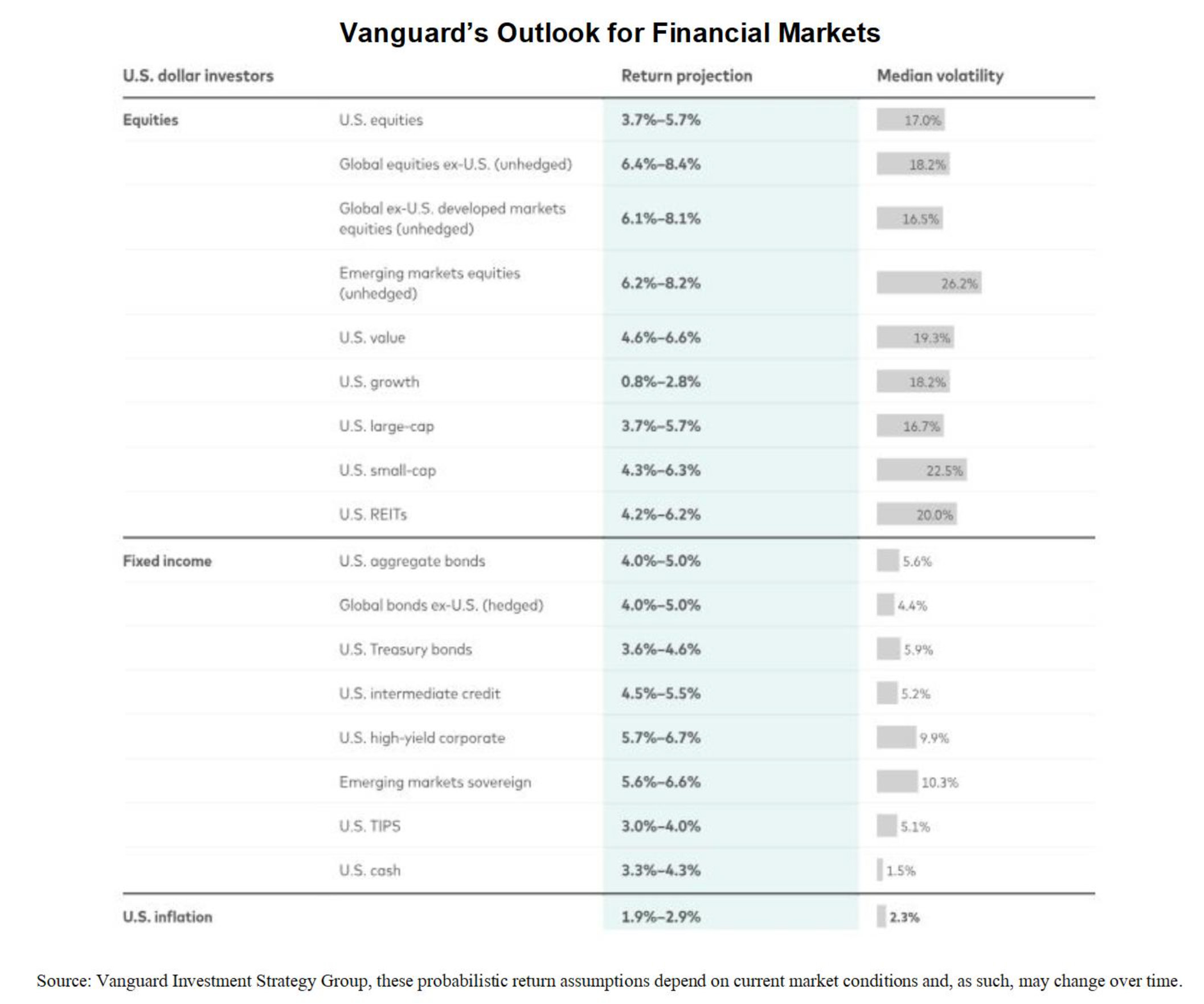 Our goal in focusing on these three priorities is to look out 3, 5, and 10 years and, hopefully, set ourselves up for success. At current valuations the 10-year outlook is for moderate growth as you can see below in the Vanguard Outlook for Financial Markets published in September 2023. iv