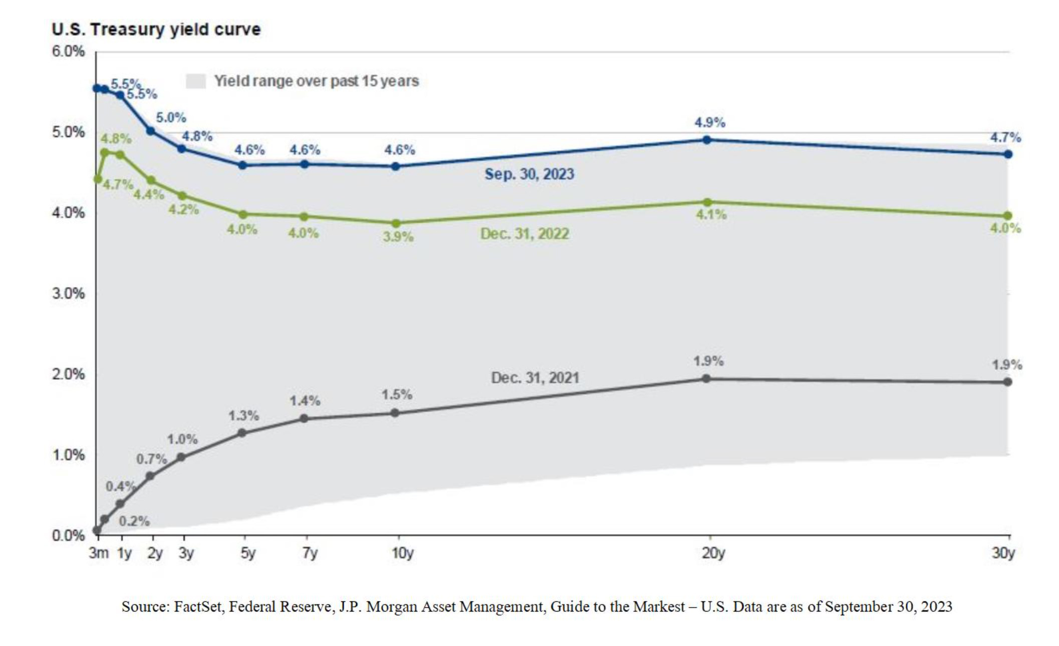 As you can see above, the yield curve has elevated substantially from just two years ago. There are now opportunities to earn yield which seemed impossible a short time ago, but are now more in line with historic norms. The short side of the curve is still inverted with short-term rates outpacing intermediate and long-term rates. However, as the higher for longer team gains steam you can see that the curve is flattening in the middle with 5 and 10-year rates now even. Investing in fixed income securities carries risks, primarily default and interest rate, but with rate increases forecast to be minimal moving forward we expect opportunities in this sector to present themselves.