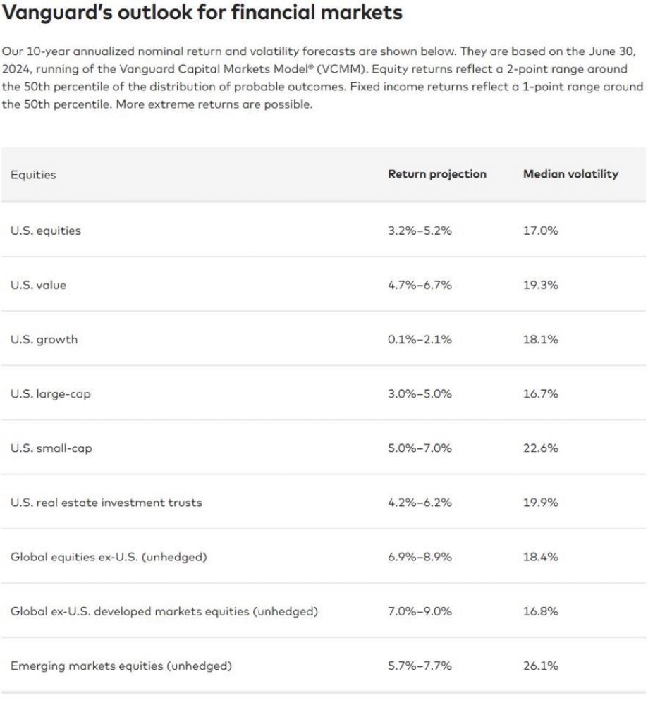 [vii] “Market Perspectives.” Our Investment and Economic Outlook, October 2024, Vanguard , 22 Oct. 2024, advisors.vanguard.com/insights/article/series/market-perspectives#projected-returns.