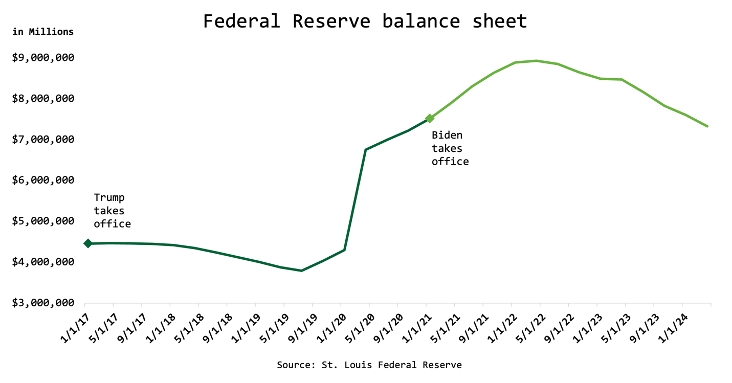 In general, the Federal Reserve explodes or steadies its balance sheet in response to global events and macroeconomic activity, not necessarily the political party in power. Notice how the balance sheet explodes in 2020, which coincides with the Fed’s stimulus programs intended to curtail the devastating effects of COVID-19 to the U.S. economy.