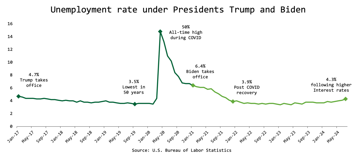 One thing to keep in mind? COVID-19 hit in the middle of this window, impacting both presidents’ data where noted.