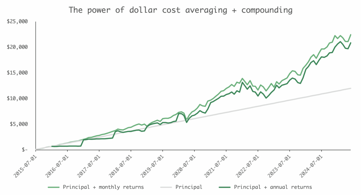 Now consider what happens if, instead of investing once a year, you had simply invested $100 every month, instead of waiting until January. This small adjustment—represented by the neon green line—would increase your overall returns by 8%. You’d have some $22,400 at the end of 10 years.