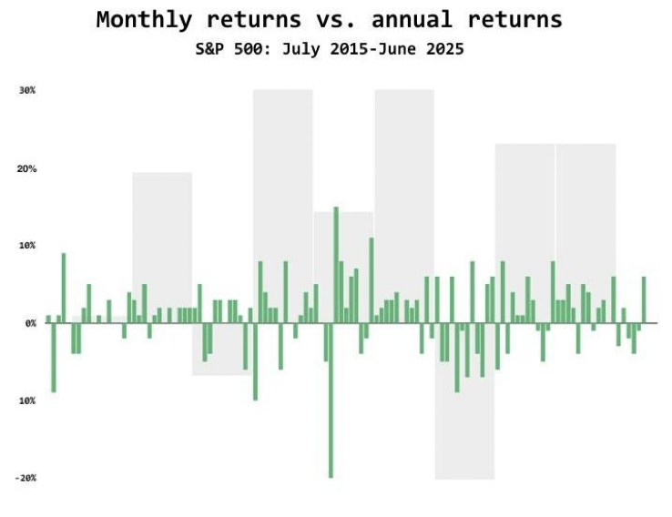 Why the increase in returns? Simply put, buying every month—or dollar cost averaging—increases your chances to buy low. There’s more ups and downs in the market in the short term than in the long term. Consider how monthly returns compared to annual returns during the period in question.