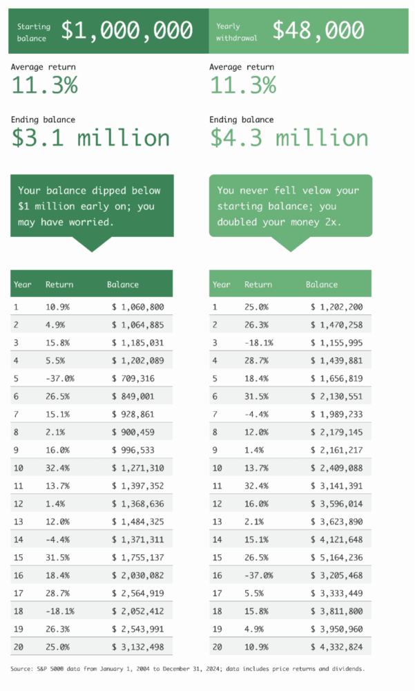 In the first instance, at left, the retiree withdraws $48,000 a year from a $1 million portfolio invested in the S&P 500.* Over the next 20 years, the index returns an average of 11.3% a year—these returns reflect the actual S&P 500 returns from January 2004 to December 31, 2024.